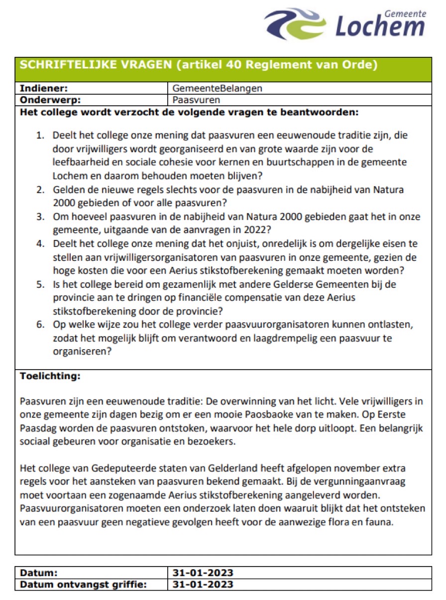 GemeenteBelangen stelt schriftelijke vragen aan college B. & W. over Paasvuren.